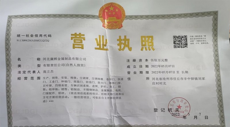 榮譽資質 證書介紹 公司生產、銷售、安裝、維修:空調罩、空調格柵、卷簾門、快速門、工業門、伸縮門、簡易門、防盜門、防火門、斷橋門窗、百葉窗、擋煙垂壁、車輛識別系統、道閘、護欄;加工、銷售:鋁單板;銷售:鋁制品、不銹鋼制品、金屬制品、電機、門窗配件、鋁材。