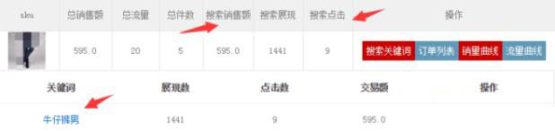 另外,你看它的關鍵詞“牛仔褲男”,它的交易額與點擊數跟上面一樣,說明,這個sku的所有搜索反饋,都完美記錄在“牛仔褲男”這個詞下。不得不說,這個商家還是具有很強的運營能力的。當然了,唯一欠缺的是:搜索銷售額太小丶搜索點擊太小,所以,該sku在牛仔褲男這個詞下,它的排名應該也不會靠太前