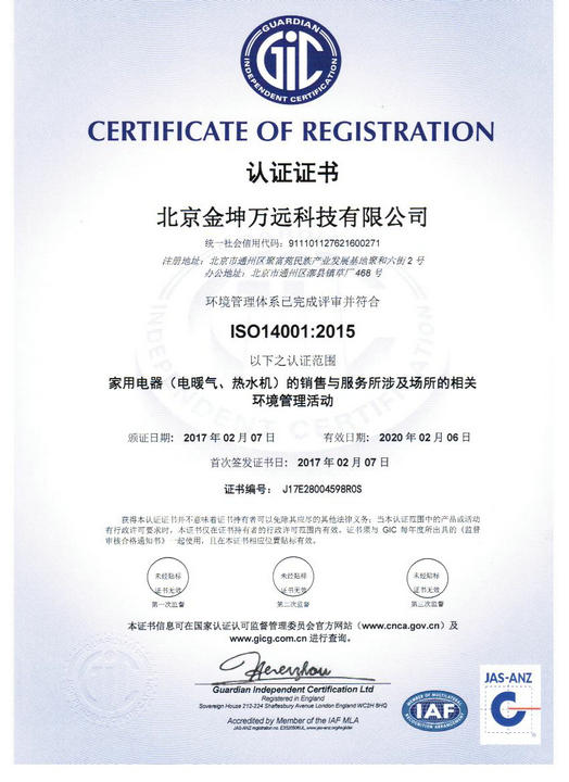 環境管理體系認證證書(ISO14001)