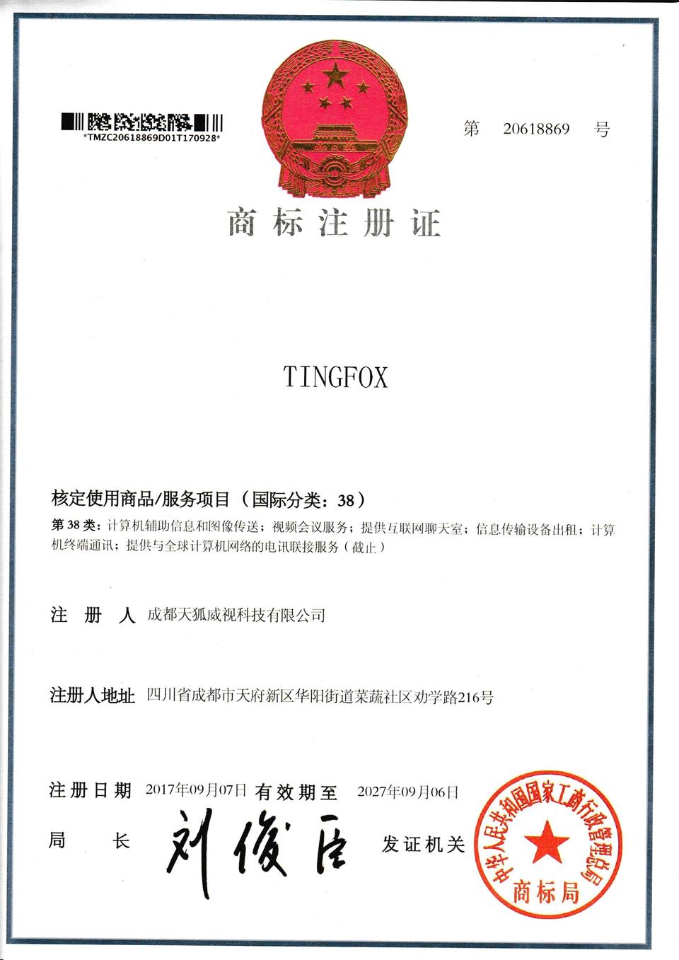 • TINGFOX商標38類