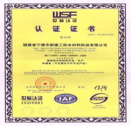 榮譽(yù)資質(zhì) 新建工防水榮獲ISO9001質(zhì)量體質(zhì)認(rèn)證證書