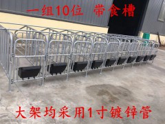 2.0鍍鋅鋼管母豬定位欄,主要供應大型豬場使用,成本低質量好,組裝方便,可為豬場有效節省占地空間,每套可供10頭豬使用,每套11片圍欄,配電前門,后門,母豬食槽可配帶,也可自己做,定位欄也可定做母豬位70寬的,管2.5厚的(中間又差價的哦)