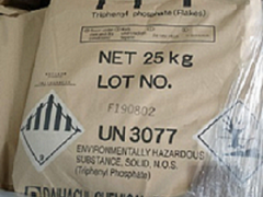 磷酸三苯酯(阻燃劑TPP)是種含磷元素的化合物,可用作無鹵環保型阻燃劑,用于溶解于有機溶劑。白色片狀固體,微有潮解性;蒸汽壓0.01kPa/20℃;閃點225℃;熔點49,9℃;沸點399℃;溶解性:不溶于水,微溶于醇,相對密度(水=1):1.21;相對蒸汽密度(空氣=1)9.42;穩定性:穩定;CAS號: 115-86-6EINECS號:204-112-2中文名稱: 磷酸三苯酯中文別名:磷酸三苯基酯;阻燃劑TPP;TPP英文名稱:Triphenyl phosphate英文別名:Triphenyl phosphoric acid ester;Phenyl Phosphate (TPPa);Triphenyl phosphate white xtl;Phosphoric acid,triphenyl ester; TPP分子式: C18H15O4P;OP(OC6H5)3外觀與性狀: 白色片狀固體,微有潮解性主要用途: 1、主要用作工程塑料及酚醛樹脂積層板的阻燃增塑劑;2、用作合成橡膠的柔軟劑、制造磷酸三甲酯的原料等;3、用作硝酸纖維素和醋酸纖維素、阻燃性增塑劑、耐火性溶劑、硝酸纖維素漆、合成樹脂、屋頂用紙的浸潤劑以及賽璐珞制造時代用品等 (歡迎免費注冊,登陸中國化工網(中網化工)行業門戶網址wokmartocom,免費發布供求,免費發布產品,免費發布企業動態)(歡迎免費注冊,登陸中國化工網(中網化工)行業門戶網址wokmartocom,免費發布供求,免費發布產品,免費發布企業動態)。