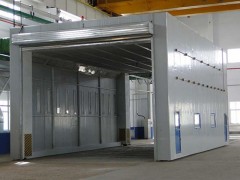 整體移動式噴漆房排風方式常見的有兩種: 一種是側進風(或房頂部)、側排風。這種排風設計管道在房體之外,長度與整體移動房體的行程相同。外側排風管道上設若干個電動風閥,而在房體側面設置若干個噴漆或打磨工位,并在此處通過伸縮汽缸實現與排風管道的自動對接。漆霧收集采用玻纖地棉過濾,過濾棉框嵌入噴漆房墻體的排風一側,而另一側墻體或者房頂設置進風過濾系統。 另外一種排風方式是上進風、下排風。這種設計為地溝排風,漆霧廢氣通過地溝引向漆霧處理器,干式或者濕式漆霧處理設備都可以。漆霧處理器可設置在不影響其他工作的任意位置。主體地溝的長度應與房體的行程相同,地溝上面封閉,可設置電動風閥,按照工作的實際情況打開或關閉風閥。也可以排風口上面設置格柵,并設有密封門,房體行走到那個工位,就把對應的排風口打開。采用地溝方式排風,進風過濾系統設置在房頂。