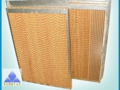 滴下浸透式濕膜加濕器工作原理:水箱中的水輸送到加濕器頂部的淋水器,水均勻地淋到濕膜的頂部,淋水器確保水均勻分配到濕膜材料上,水在重力作用下沿濕膜材料向下浸透,淋濕濕膜內部的所有層面,同時被濕膜材料吸收,形成均勻的水膜.當干燥的風通過濕膜材料時,干燥的空氣和濕潤的濕膜表面有較大面積的接觸,水份充分吸收空氣的熱量而汽化、蒸發,從而達到對空氣加濕的目的。在這一加濕過程中,空氣的濕度增加,溫度下降,但空氣的焓值不變。目前濕膜加濕器有四種材料,有機濕膜、無機玻璃纖維濕膜、金屬鋁合金濕膜,金屬不銹鋼濕膜,在中央空調幾組、新風機組、機房空調等加濕段配套的以有機濕膜材料最多。