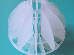 采用聚丙烯(PP)塑料制成球狀,由兩個半球合成一個球形,每個半球上根據(jù)設計需要有8-12個半扇形葉片,兩個半球的扇形葉片相互錯開。該填料特點是比表面積大,空隙率較高。但是由于葉片數(shù)偏多,彼此間有遮蔽效應,不利于液體分布和潤濕;液體大多在球體空心柱聚集,阻礙氣體暢通,因此阻力較大。此種填料多用于廢氣處理和水處理工程
